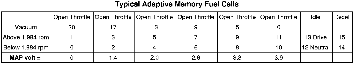 The number of cells varies upon the driving conditions. Two cells are used only during idle, based upon TPS and Park/Neutral switch inputs. There may be two other cells used for deceleration, based on TPS, engine rpm, and vehicle speed. The other twelve cells represent a manifold pressure and an rpm range. Six of the cells are high rpm and the other six are low rpm. Each of these cells has a specific MAP voltage range Typical Adaptive Memory Fuel Cells.