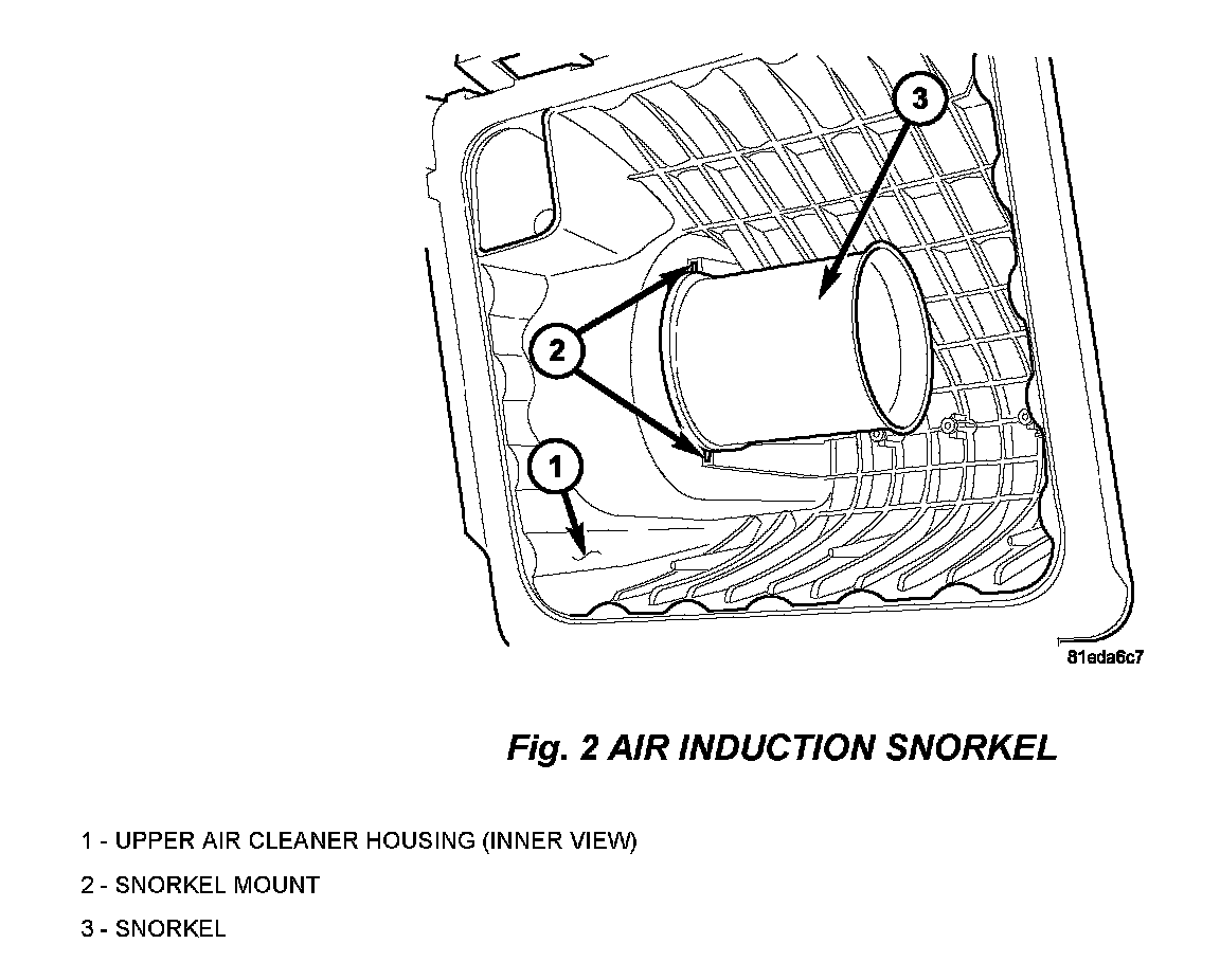 2. Lift the upper housing up and locate the snorkel attached to the upper housing (throttle body air inlet) (Fig. 2). Unsnap, remove and discard the long snorkel.