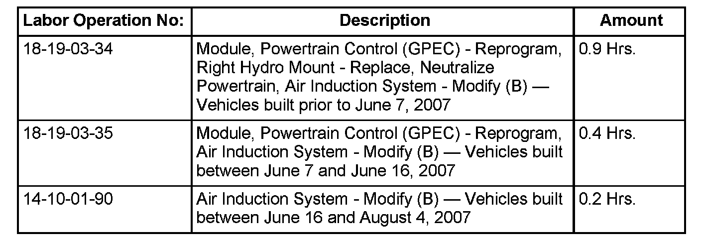 This bulletin applies to models equipped with a 2.4L gasoline engine (Sales Code ED3) as follows: Engine Mount replacement applies to models built prior to June 7, 2007 (MDHO6O7XX), Flash portion applies to models built prior to June 16, 2007 (MDH 0616XX), and Air Induction System modification applies to models built prior to August 4, 2007 (MDH0804XX). See Labor Operation Breakdown for proper combination of repairs to clean point.
