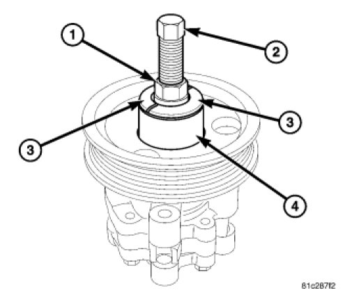CAUTION: Do not hammer on power steering pump pulley or shaft to remove power steering pump pulley. Damage to pulley and power steering pump will occur.