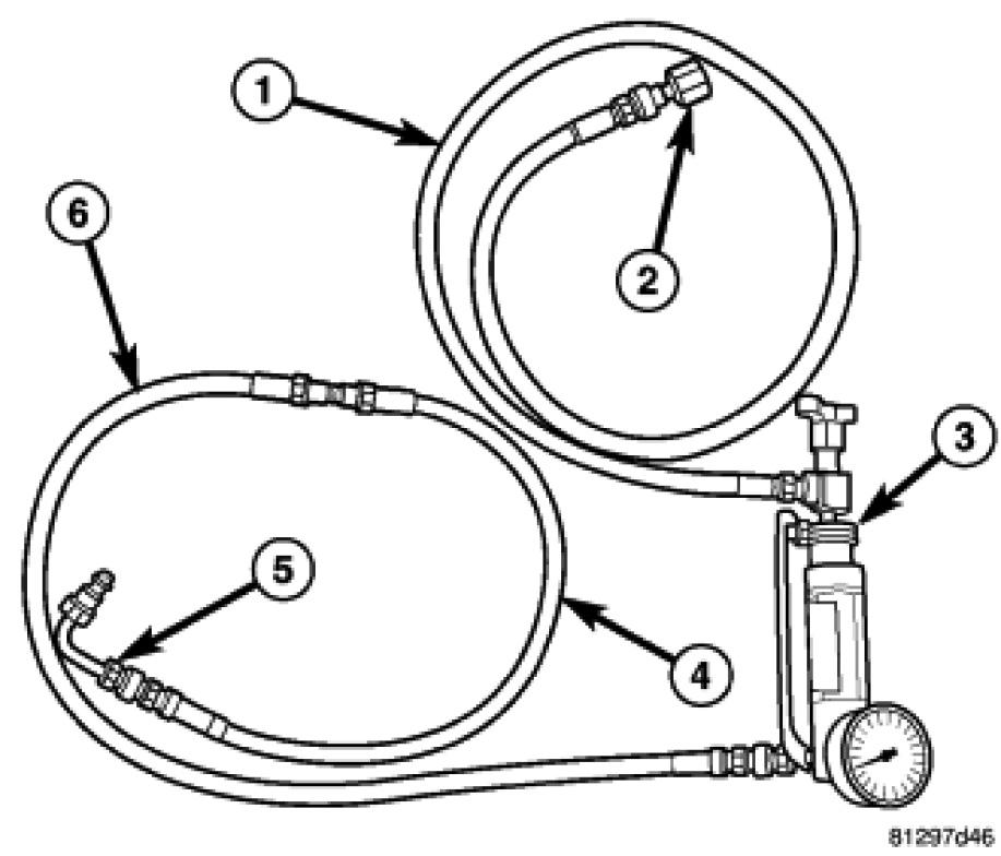 5. Connect Adapter Fitting 6844 (4) (on Hose 6713 (3) leading to Analyzer inlet), to the open power steering pump pressure fitting (6). Tighten the tube nut. Specifications