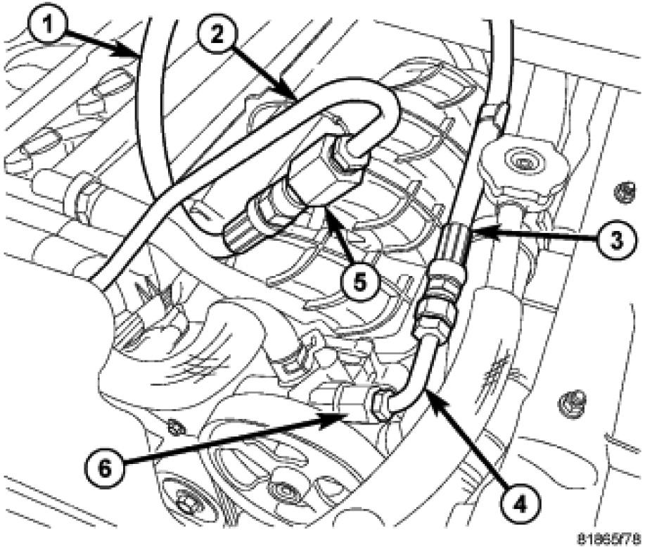 3. Unthread the tube nut (3) and disconnect the power steering pressure hose (1) at the power steering pump pressure fitting (5).