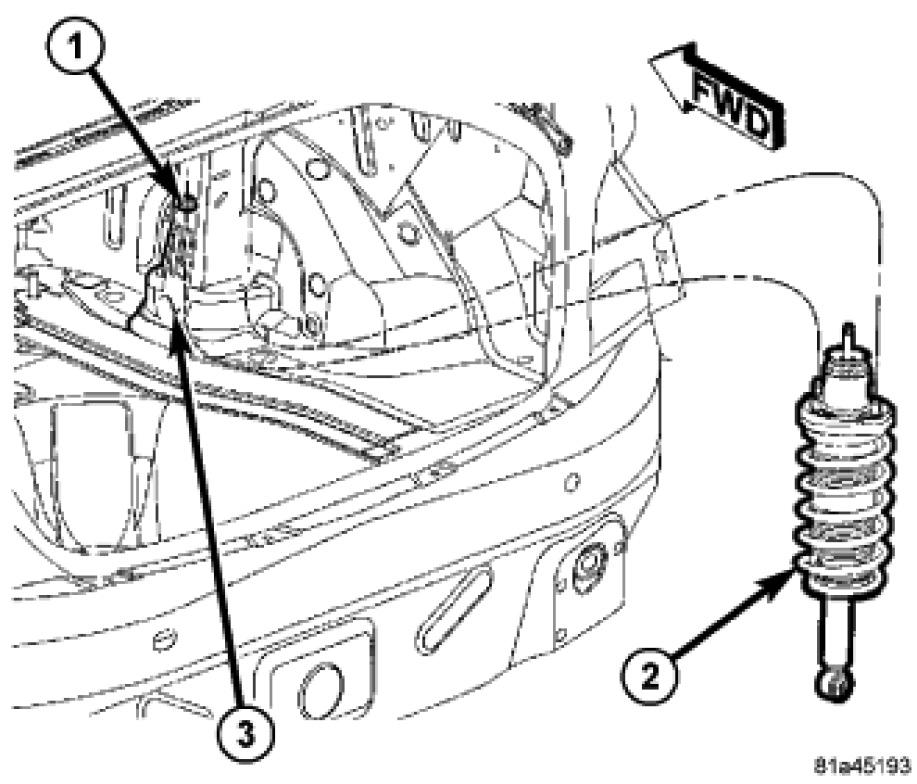 1. Insert the lower end of the shock assembly (2) down though the lower control arm from above just enough to clear the body, then lift it up into the body bracket (3).