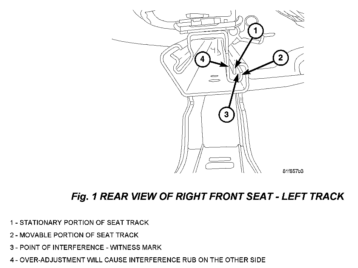 This bulletin involves inspecting the seat track for metal to metal contact. The stationary track may have a rolled in rear corner causing interference. If this corner is contacting movable track, track adjustment is necessary.