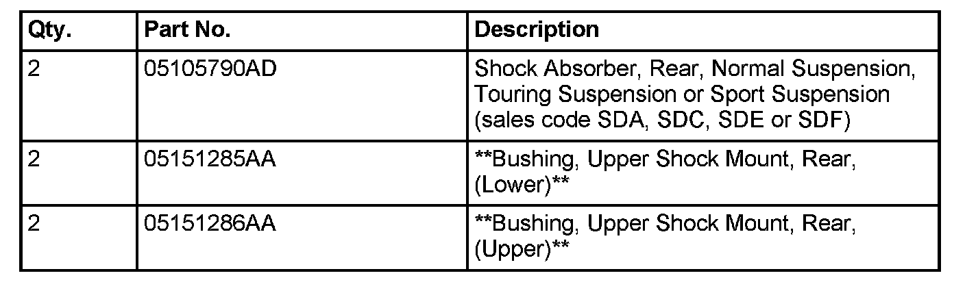 3. Assemble replacement shock absorber assembly using p/n 05105790AD and install replacement bushings for the upper mount with p/n **05151285AA (upper) and p/n 05151286AA (lower)**. Refer to the detailed installation procedures available in DealerCONNECT > TechCONNECT under: Service Info > 2 - SUSPENSION > REAR SUSPENSION > SHOCK ASSEMBLY > ASSEMBLY> SHOCK ASSEMBLY.