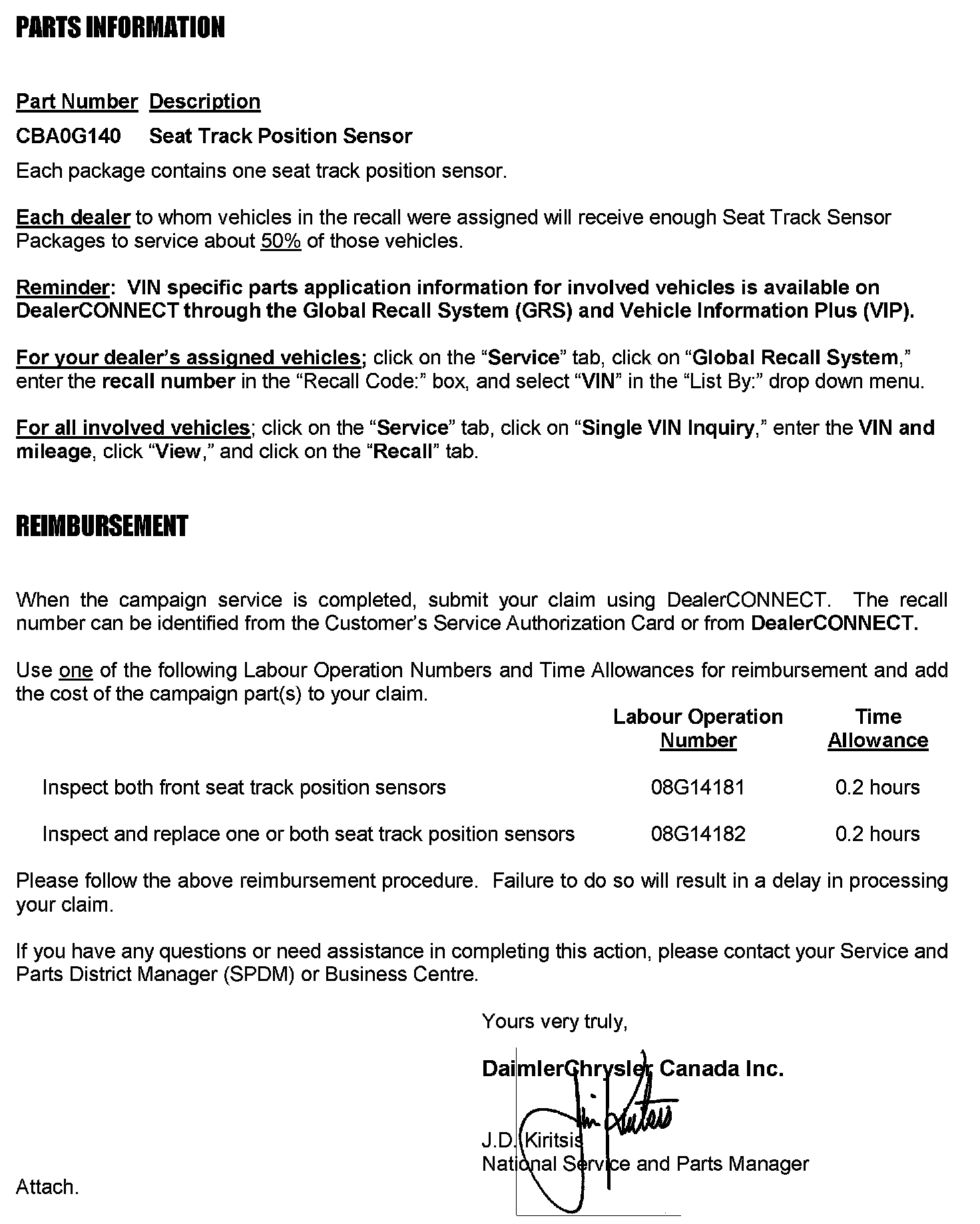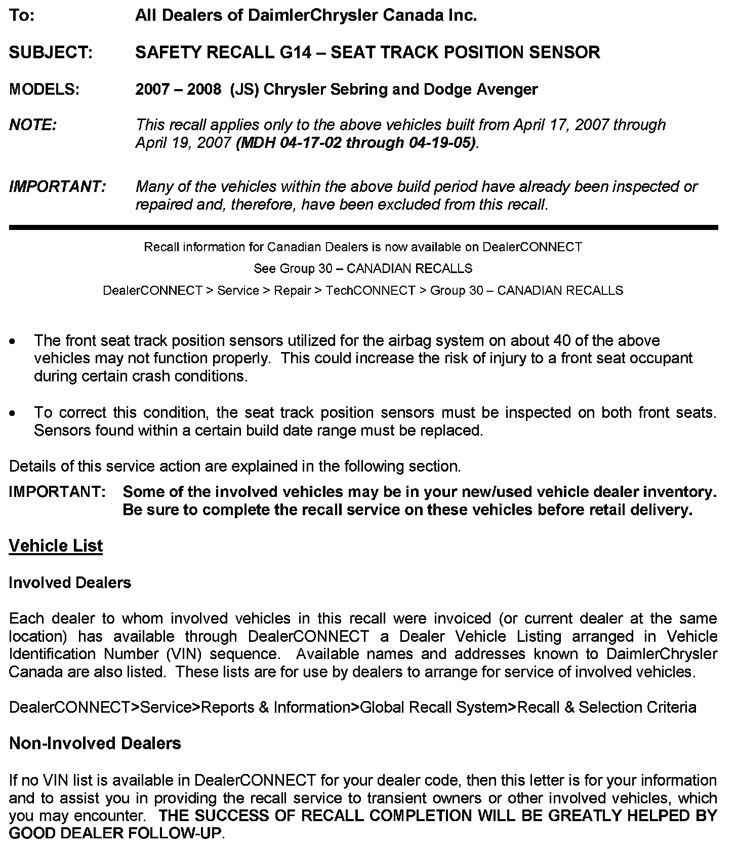 SAFETY RECALL G14 - SEAT TRACK POSITION SENSOR