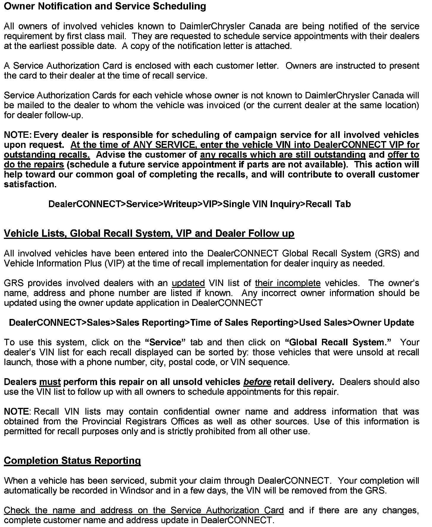 GRS has been developed to provide dealers with an up-to-date list of involved vehicles by recall number and by dealer code. Owners known to DaimlerChrysler are also listed. Involved vehicles will be removed from the GRS within several days of submitting repair claims.