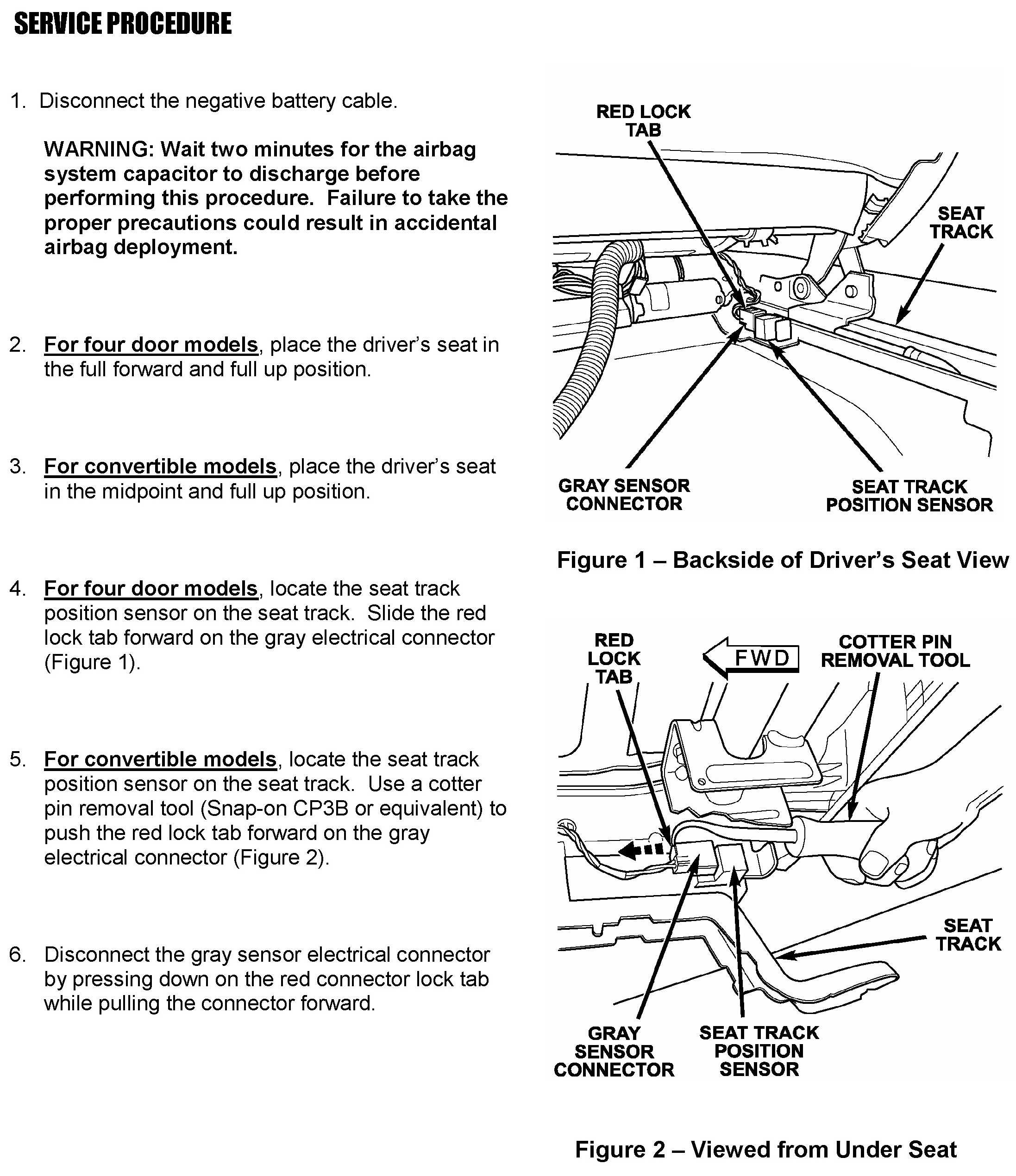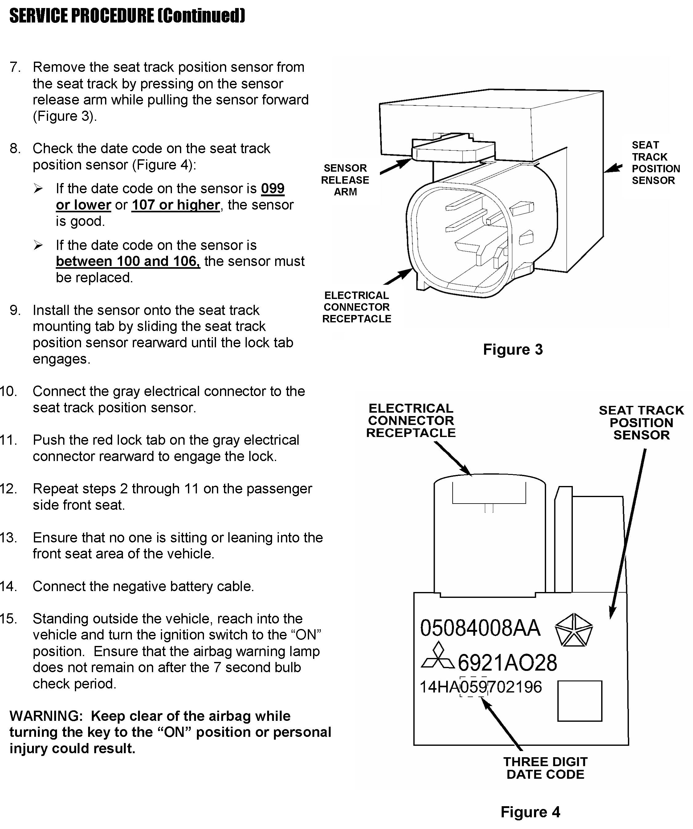 ^ To correct this condition, the seat track position sensors must be inspected on both front seat's. Sensors found within a certain build date range must be replaced.