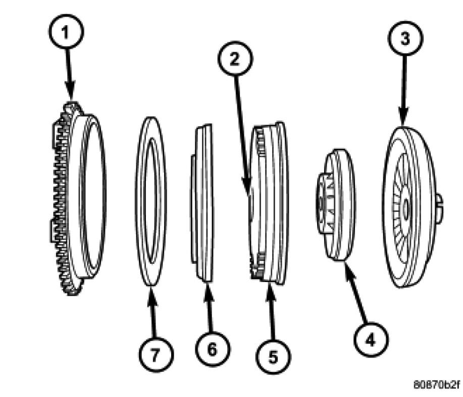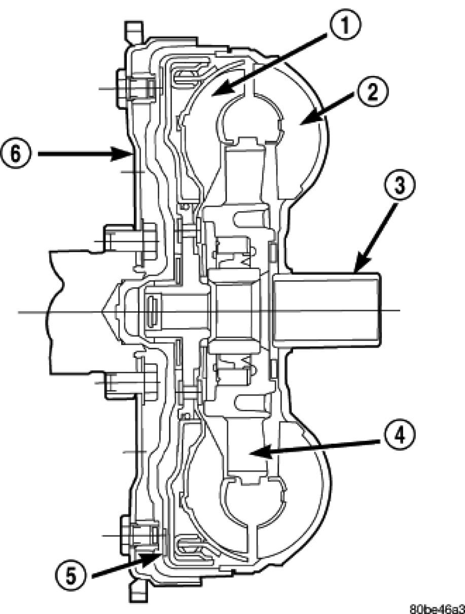 The torque converter is a hydraulic device that couples the engine crankshaft to the transmission. The torque converter consists of an outer shell with an internal turbine (1), a stator (4), an over-running clutch, an impeller (2) and an electronically applied converter clutch (5). The converter clutch provides reduced engine speed and greater fuel economy when engaged. Clutch engagement also provides reduced transmission fluid temperatures. The converter clutch engages in third gear. The torque converter hub (3) drives the transmission oil (fluid) pump.