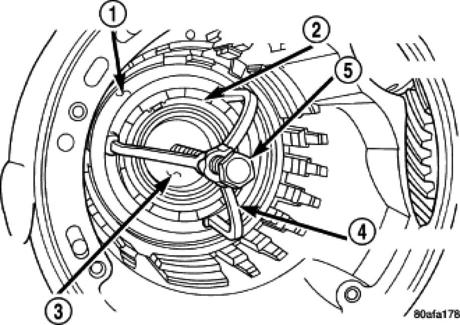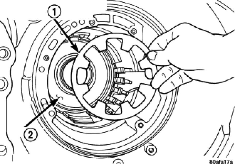 12. Compress low/reverse piston and install snap ring. Snap ring opening must be between spring levers (1).
