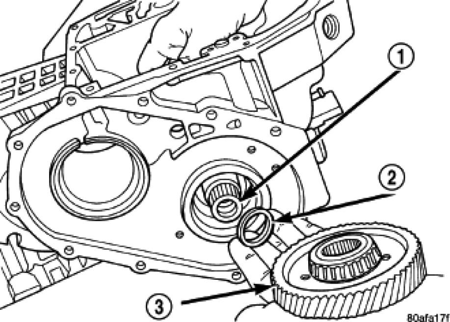 40. Install a bead of Mopar(R) ATF RTV (MS-GF41) (2) to transfer gear cover.