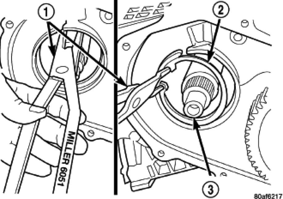 31. Using Snap Ring Pliers 6051 (1), install transfer shaft bearing snap ring (2).
