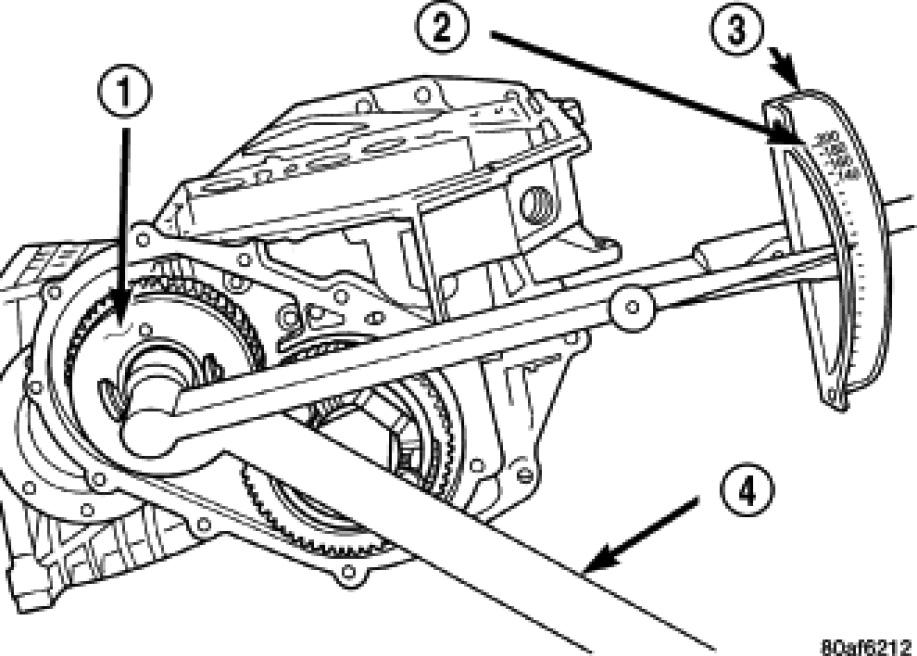 c. Using a Dial Indicator (2) mounted to the transaxle case, measure output gear (4) end play.