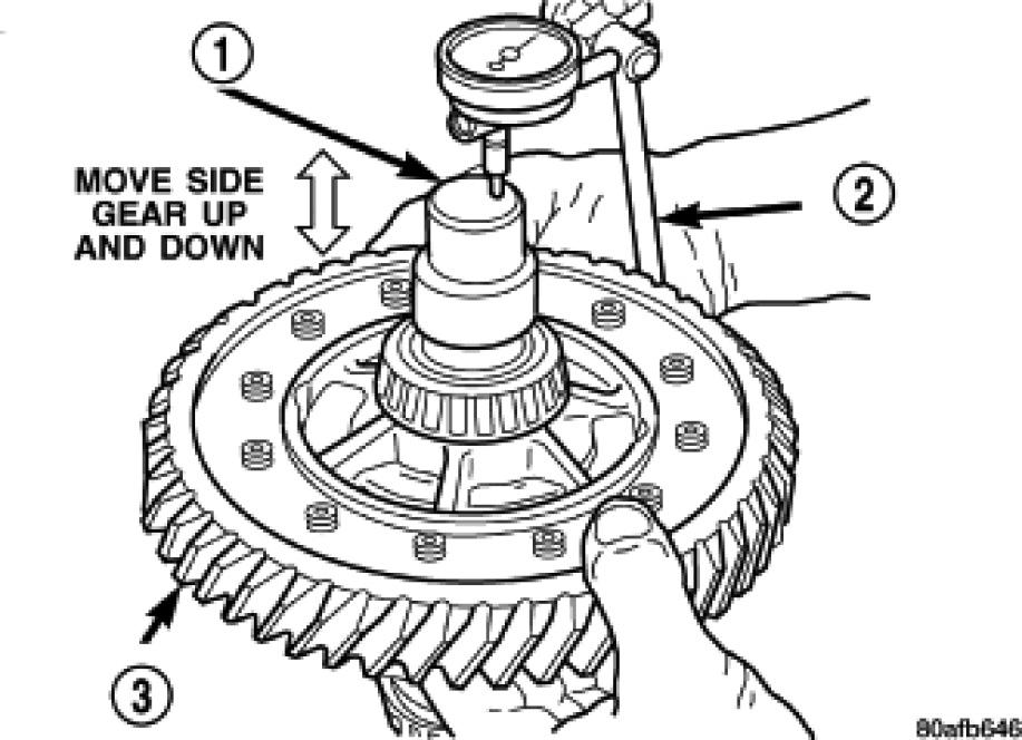 7. Set up Dial Indicator Set C-3339 (2) and Adaptor C-4996 (1) to measure side gear end play (Ring Gear Side).Side gear end play must be within 0.001-0.013 in.