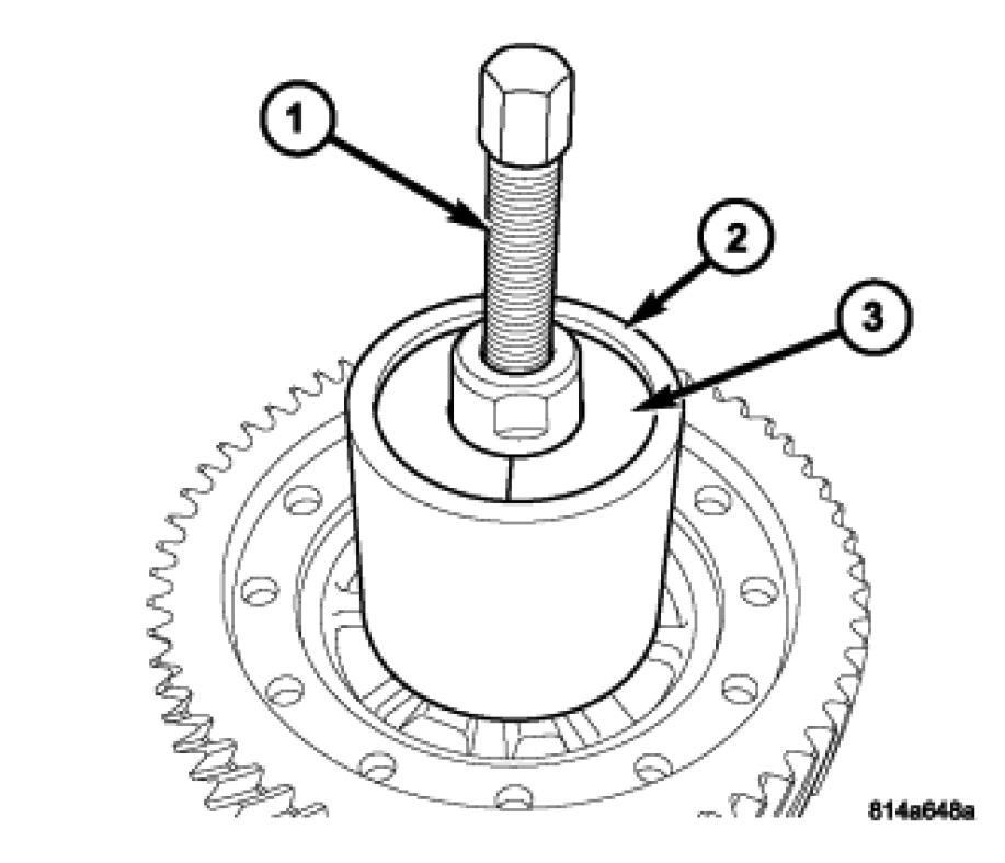 8. Remove differential side bearing cone (3) from ring gear side of differential. Install Thrust Button L-4539-2 (2), and Collets 5048-4 (1).