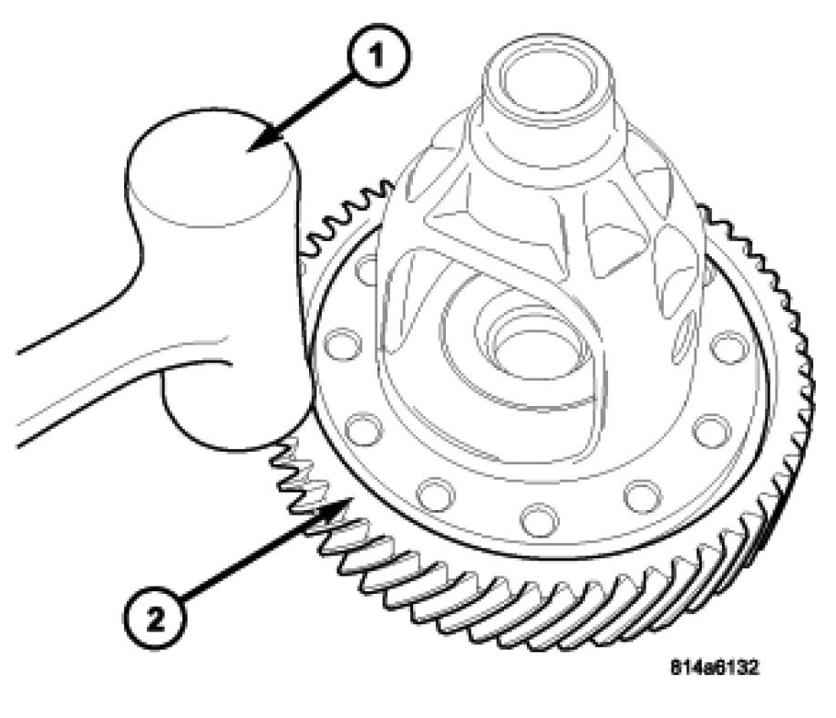 19. Using a soft-faced hammer (1), remove ring gear (2) from case.