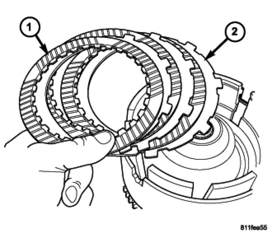 12. Install the UD clutch pack (1,2). Leave out upper disc, until snap ring is installed.