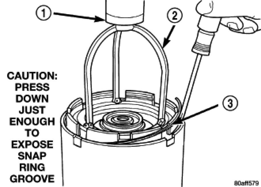 27. Install OD pressure plate flat snap ring (3) using Compressor 5059A (2) and an Arbor Press (1).