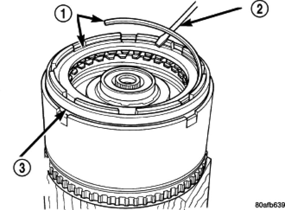 15. Place the OD/UD clutch reaction plate (1) and snap ring into position. The OD/UD clutches reaction plate has a step on both sides. Install the OD/UD clutches reaction plate tapered step side up.