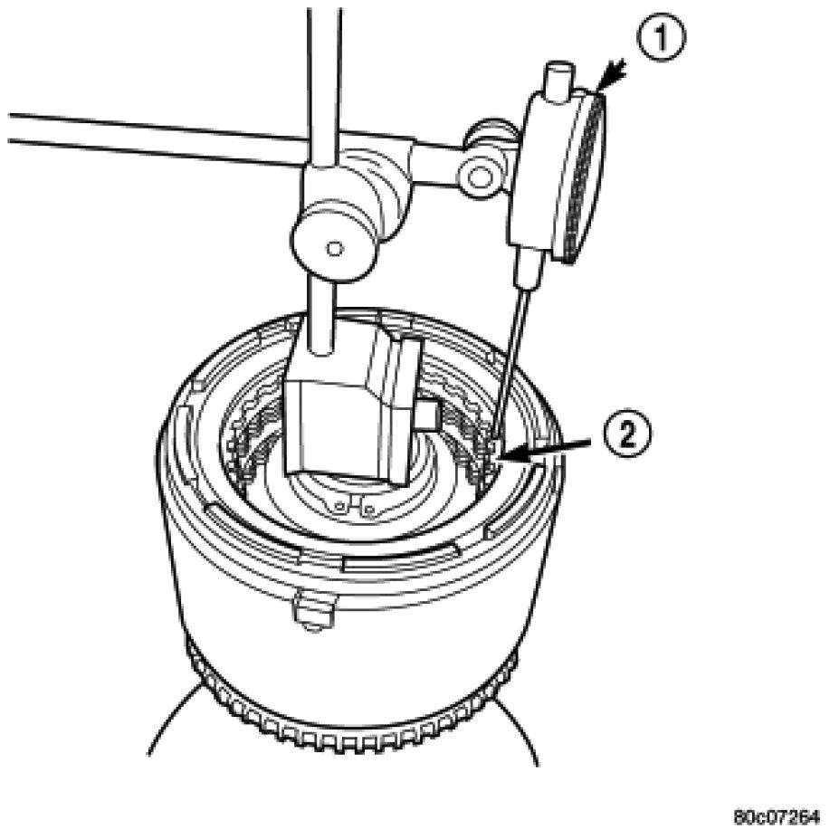 36. Using moderate pressure, press down and hold (near indicator) reverse clutch disc (2) with screwdriver or suitable tool and zero dial indicator (1). When releasing pressure, indicator should advance 0.005-0.010 as clutch pack relaxes.