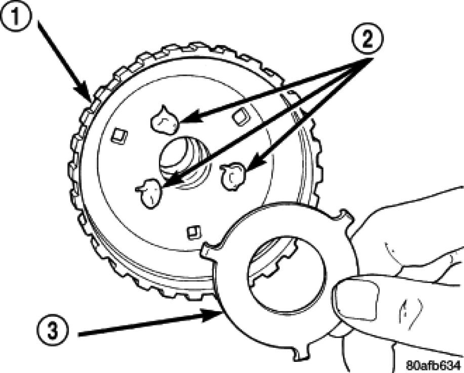 43. Install the #3 thrust plate (note 3 tabs) (3) to the bottom of the overdrive shaft assembly (1). Retain with petrolatum or transmission assembly gel (2).