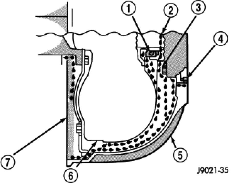 Some suspected converter housing fluid leaks may not be leaks at all. They may only be the result of residual fluid in the converter housing, or excess fluid spilled during factory fill, or fill after repair. Converter housing leaks have several potential sources inspect pump seal (1), pump vent (2), pump bolts (3), pump gasket (4), converter housing (5), converter (6) and a rear main seal leak (7). Through careful observation, a leak source can be identified before removing the transmission for repair.