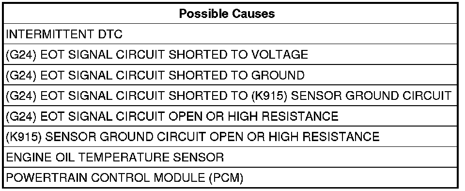 Measure the resistance of the (G24) EOT Signal circuit between the Engine Oil Temperature Sensor harness connector and the Powertrain Control Module (PCM) harness connector.
