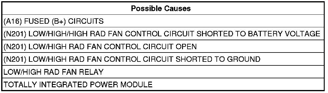 - Repair the short to ground in the (N201) Low/High Rad Fan Control circuit.
