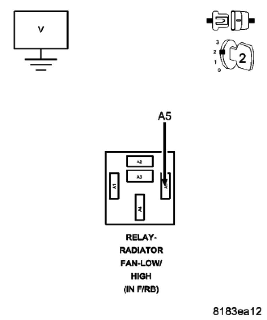 Using a 12-volt test light connected to battery voltage, probe the (N201) Low/High Rad Fan Control circuit in the Low/High Rad Relay harness connector.