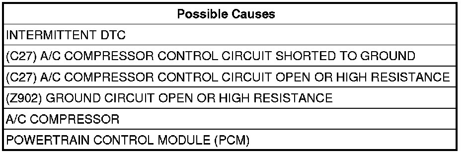 - Repair the (C27) A/C Compressor Control circuit for a short to ground.