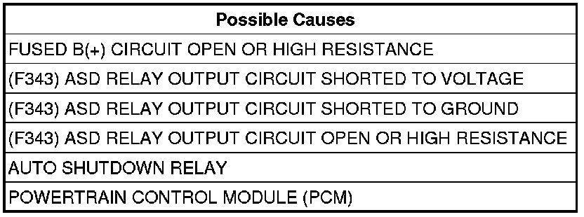 - Repair the short to ground in the (F343) ASD Relay Output circuit.