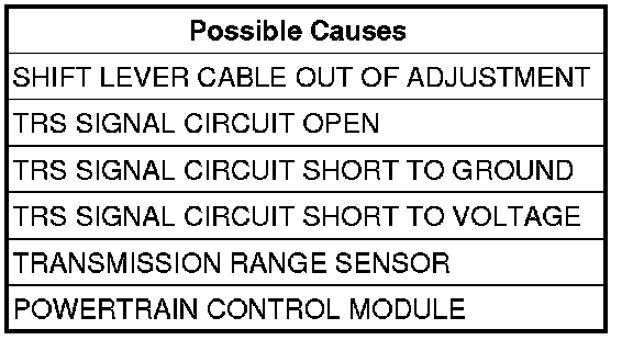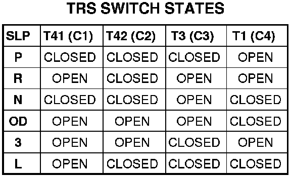 The C1 through C4 (T41, T42, T3, and T1) Signal circuits communicate the shift lever position to the PCM by terminating their respective circuits by the use of a Transmission Range Sensor (TRS). Depending on the shift lever position, each switch can be either open or closed which is then decoded by the PCM to determine the shift lever position. Each shift lever position has a certain combination of open or closed circuits and if a particular switch is open or closed in a wrong combination a PRNDL code will set. There are only 9 possible valid codes (8 for AutoStick(R)), one for each gear position and three recognized between gear codes. The remainder of the codes should never occur, these are called invalid codes. The chart below shows the normal switch states for each shift lever position.