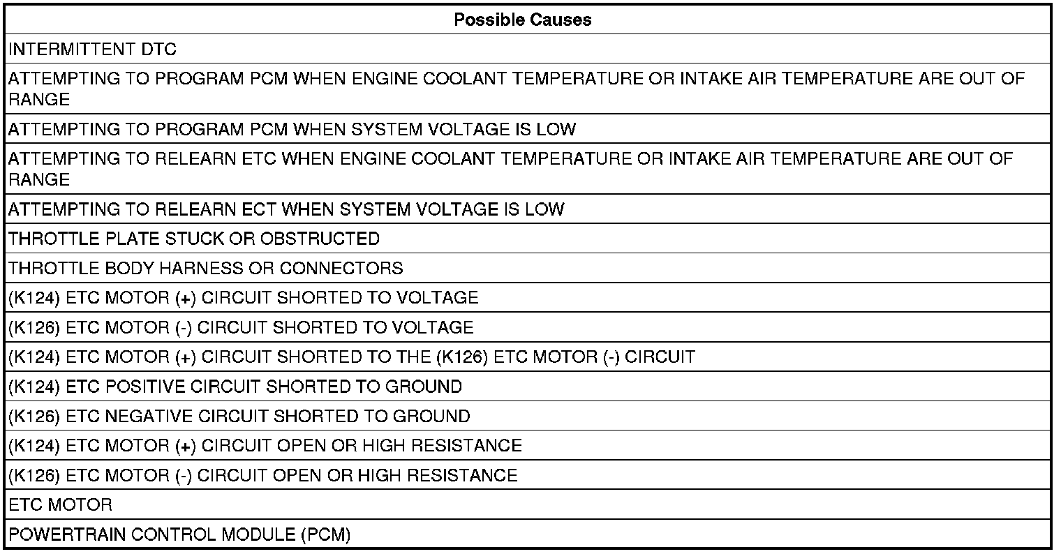 NOTE: Engine coolant temperature must be between 5° C (41° F) and 110° C (230° F), intake air temperature must be greater than 5° C (41° F), and battery voltage must be greater than 10 volts when performing the ETC Relearn function. If these parameters are not met during the relearn process, this DTC may set.