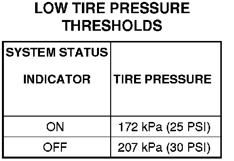 The SKREEM monitors the signals from the tire pressure sensor/transmitters and determines if any tire has gone below the low pressure threshold LOW TIRE PRESSURE THRESHOLDS table.