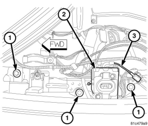 4. Remove the decklid forward latch bracket retaining bolts (1).