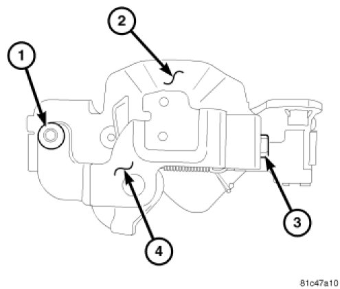 10. Using an 1/8 in. drill bit, drill out the rivet (1) securing the switch (4) to the decklid forward latch (2). Lift the switch upward to release the retaining tab (3) and remove the switch from the latch (2).