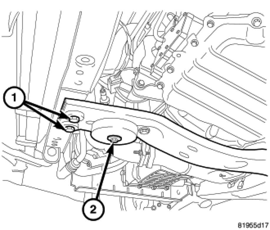 5. Remove crossmember front mounting bolts (1).
