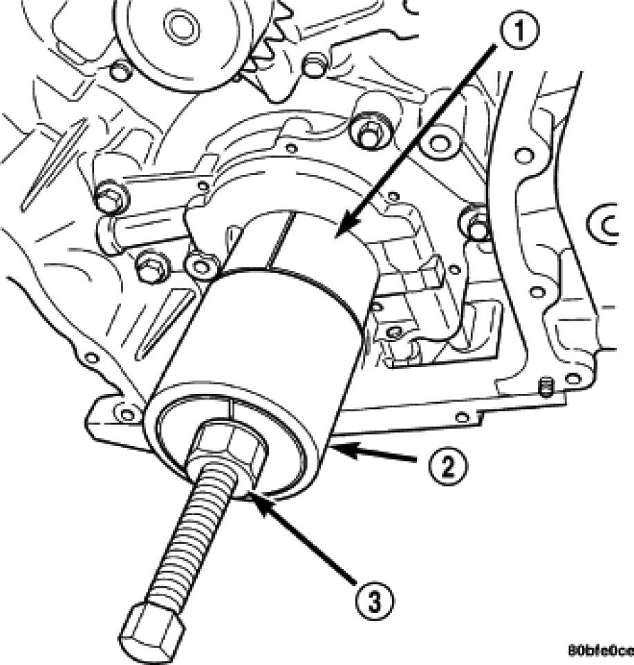 2. Remove crankshaft sprocket by first installing the crankshaft damper bolt. Apply grease or equivalent to damper bolt head and position Special Tools 5048-1, 5048-6, and 8539 (1) on sprocket and crankshaft nose. Remove sprocket using care not to rotate the crankshaft.