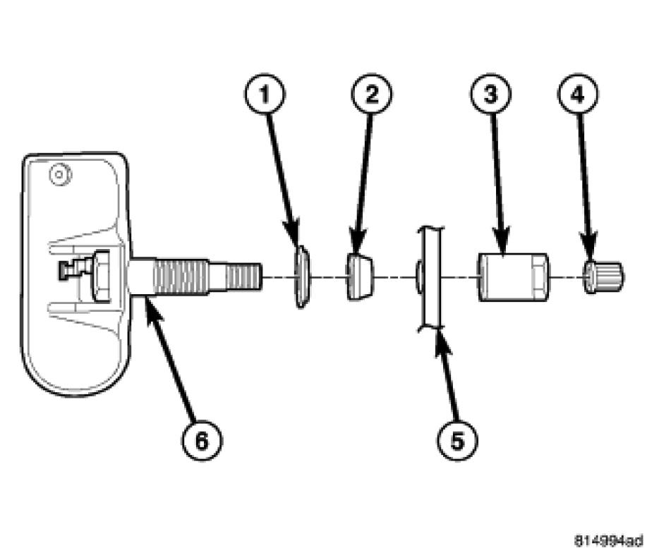 NOTE: Any time a sensor is installed on a wheel, a new Sensor-To-Wheel Seal (2), Metal Washer (1) and Valve Stem Nut (3) must be installed to ensure air tight sealing. A service kit is available.
