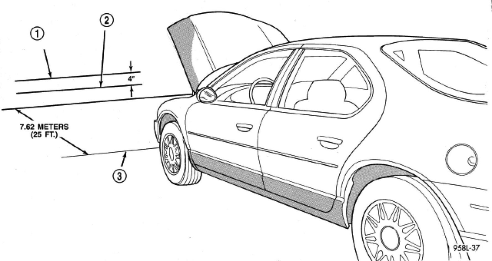 Prepare an alignment screen Adjustments. A properly aligned fog lamp unit will project a pattern on the alignment screen 100 mm (4 in.) (2) below the fog lamp center line (1) and straight ahead.