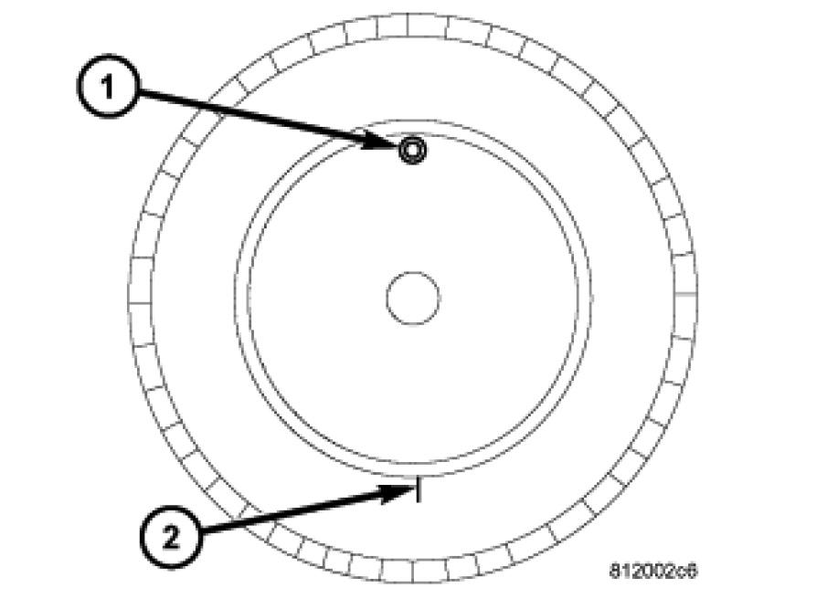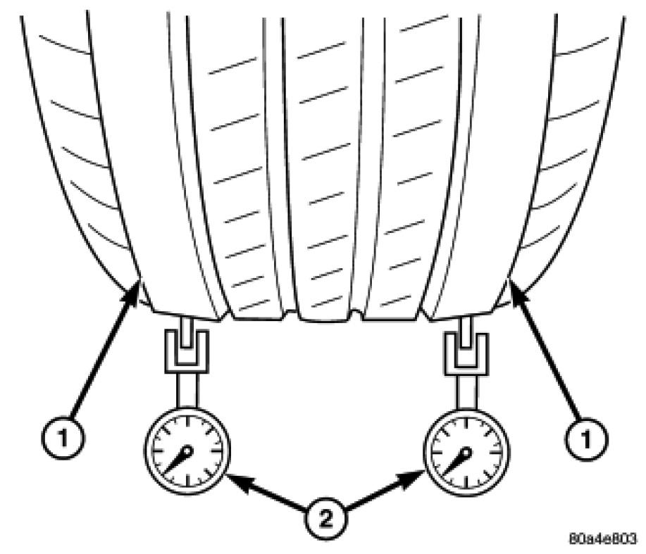 c. Check system runout using Dial Indicator Set, Special Tool C-3339A with 25-W wheel, or equivalent. Place the end of the indicator against each taped area (one at a time) (2) and rotate the tire and wheel. System radial runout should not exceed 0.76 mm (0.030 inch) with no tread "dips" or "steps." Tread "dips" and "steps" can be identified by spikes of the dial indicator gauge.