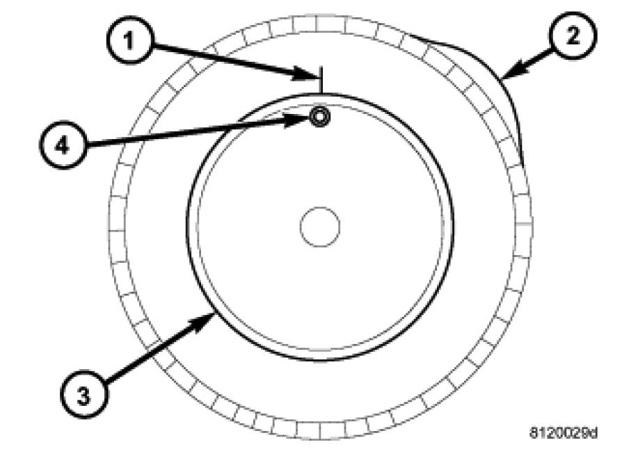 If runout exceeds limits, mark the original location of the tire on the wheel at the valve stem (1)(4). Also, mark the tire and wheel to indicate the original high spot (2) of the assembly and record the runout measurement.