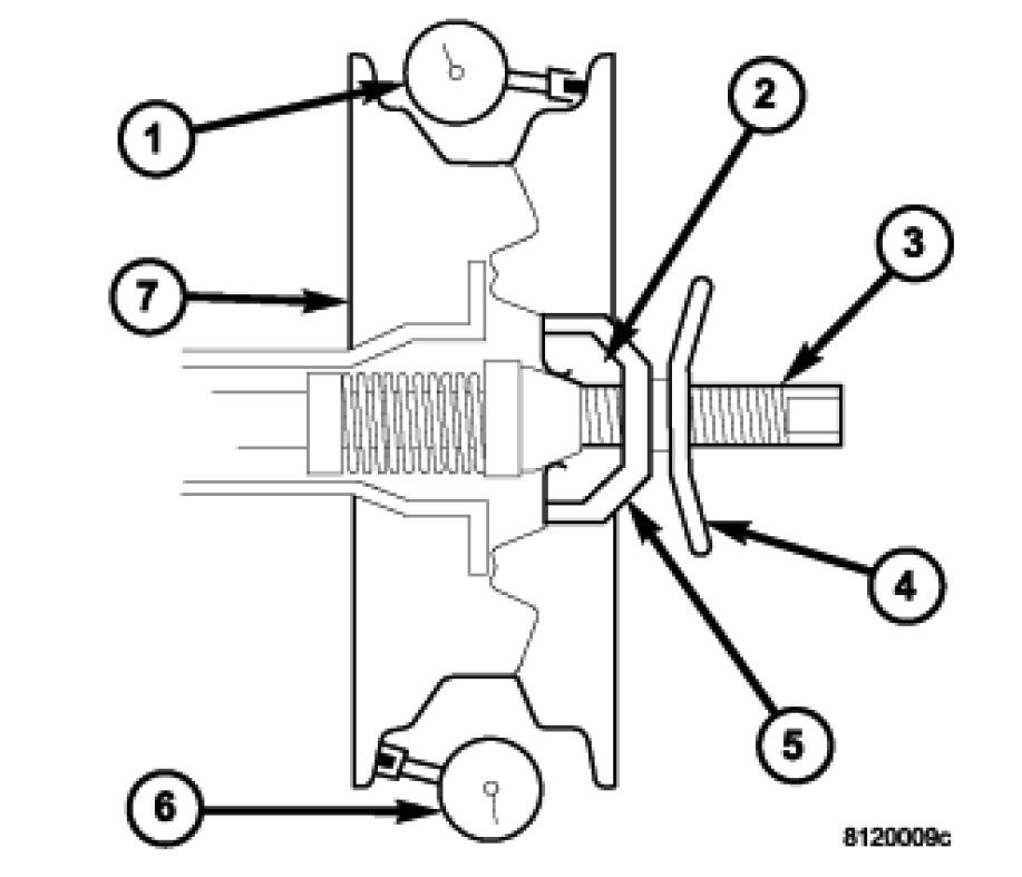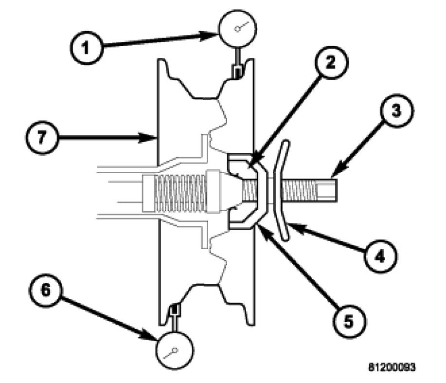 d. If system runout is excessive, re-index the tire and wheel assembly on the hub. Remove assembly from vehicle and install it back on the hub two studs over from original mounting position. If re-indexing the tire and wheel assembly corrects or reduces system runout, check hub runout and repair as necessary Testing and Inspection.