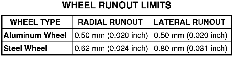 d. If runout exceeds limits, the tire will need to be dismounted from the wheel to verify wheel vs. tire contribution. Refer to Wheel Runout below.