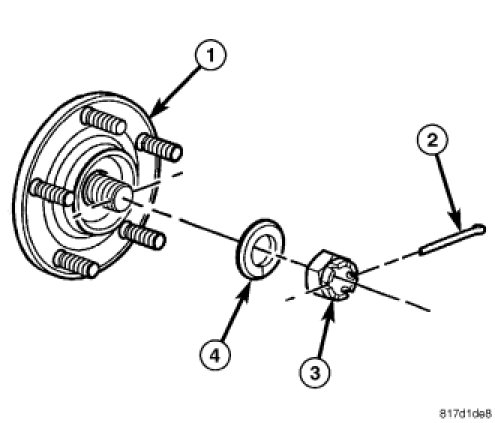 10. Insert the cotter pin (2) through the notches in the nut and the hole in half shaft. If the notches in the nut do not line up with the hole in the half shaft, continue to tighten the nut until they do. Do not loosen the nut.