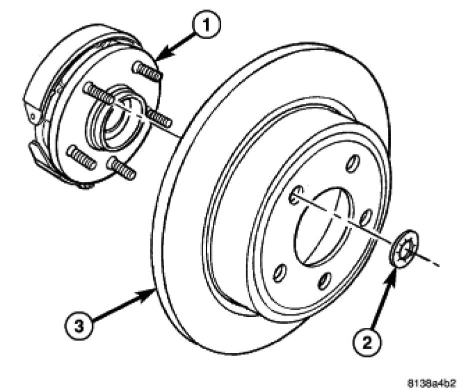 4. Slide the brake rotor (3) over the parking brake shoes and onto the hub and bearing (1).