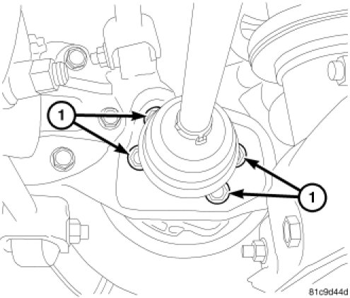 2. Install the four bolts (1) securing the hub and bearing to the knuckle. Tighten the bolts to 105 Nm (77 ft. lbs.).