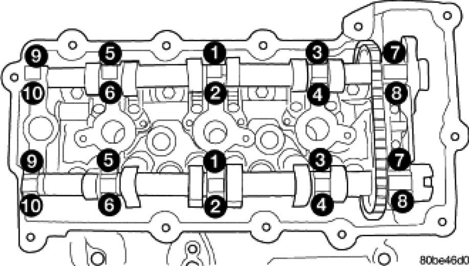 Tighten cam bearing cap bolts gradually in sequence shown to 12 Nm (105 in. lbs.).