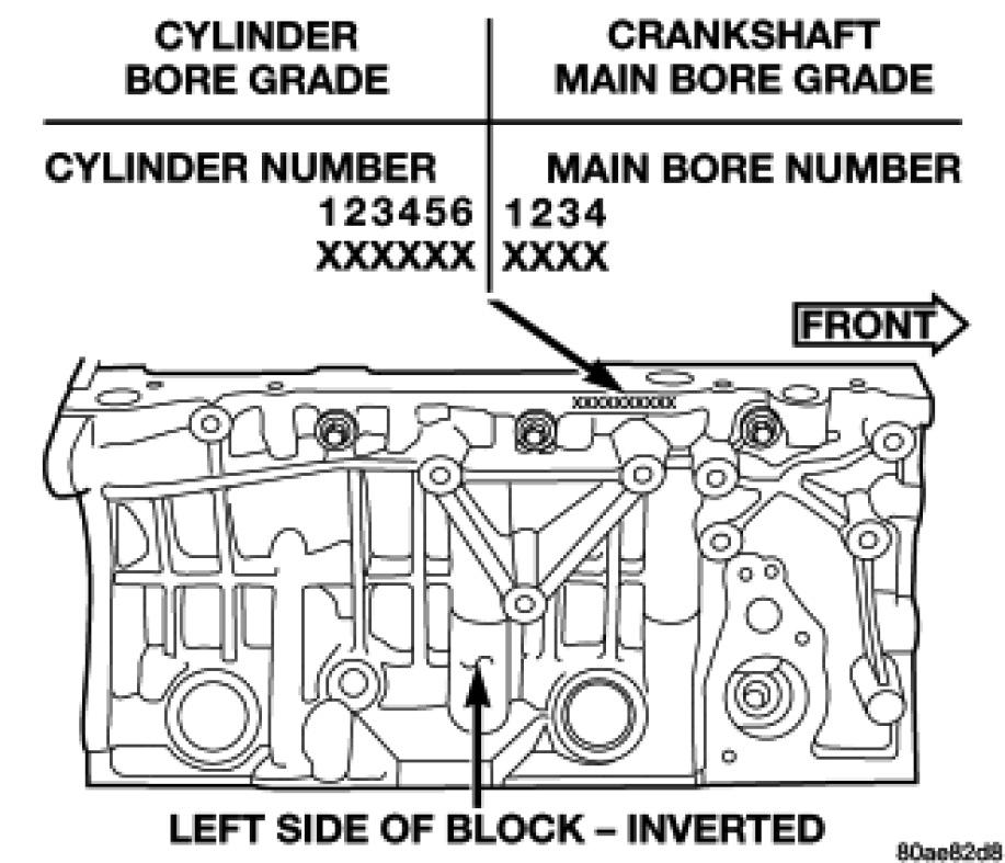 The grade marks for the cylinder block main bearing bore grade is located on the pan rail just below the left side engine mount bracket. These marks are read left to right, corresponding to main bore 1, 2, 3, 4.