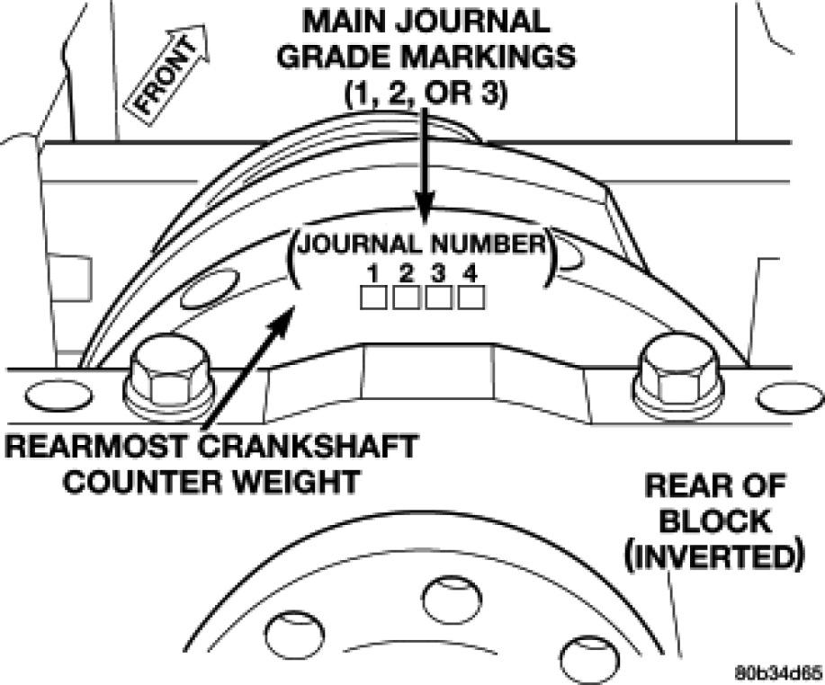 The main bearings are "select fit" to achieve proper oil clearances. For main bearing selection, the block and crankshaft have grade identification marks.